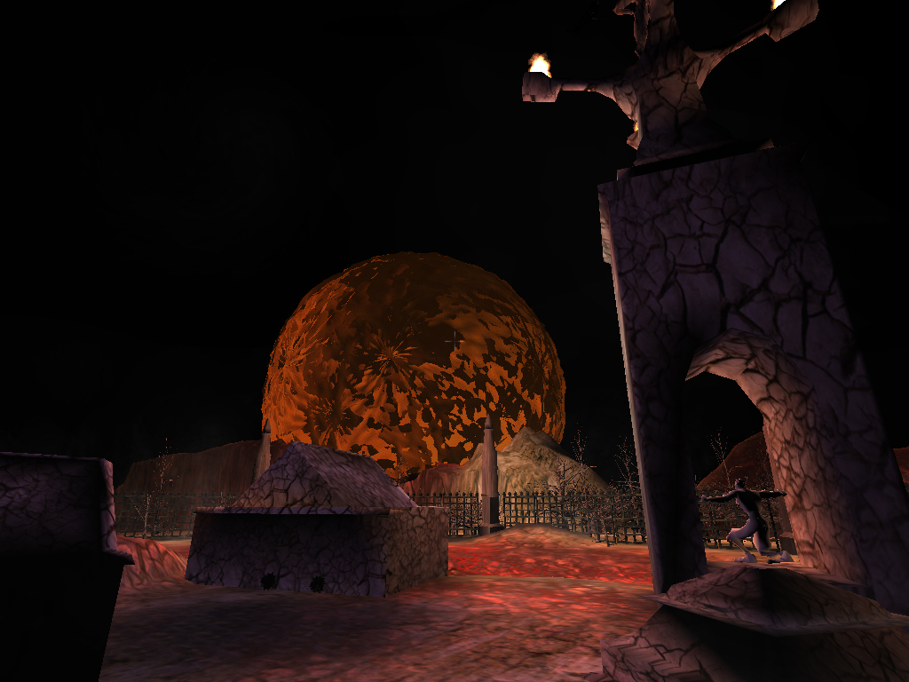 He walks aimlessly across the odd terrain; spouts of fire materialize then quickly vanish. Strange lights, sounds and creatures swirl around as if searching for something or someone. Several objects or structures fade in and out of existence, they resemble gateways or portals.